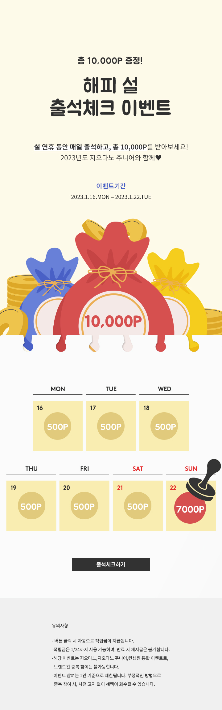 * 1/22(일) 에 지급되는 7,000p는 1/18(수)~1/22(일) 누적으로 연속 출석해야만 지급됩니다.