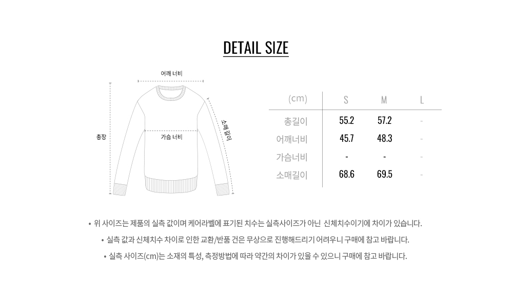 넥·밑단·소매단은 1×1 립과 1/2"" 후꾸로 마감으로 안정적인 착용감과