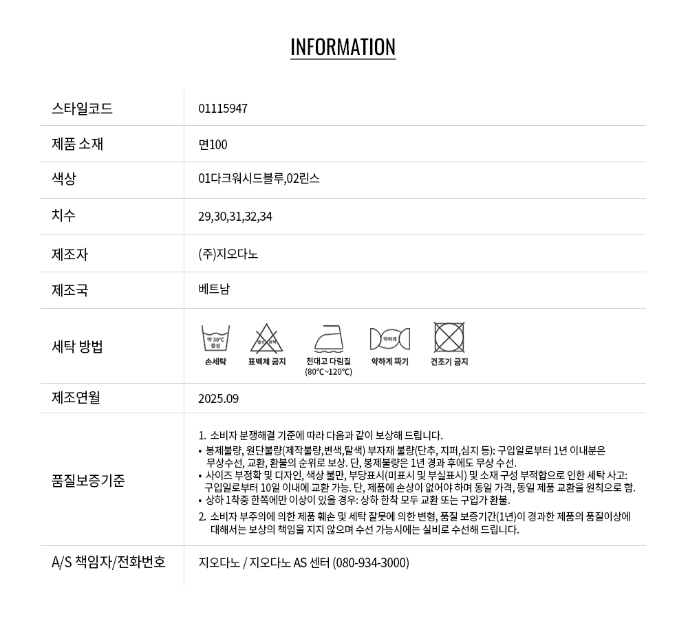 **데님 염료의 특성상 이염 및 물빠짐이 불가피하므로 반드시 미지근한 물에 뒤집어서 단독 세탁하시기 바랍니다.