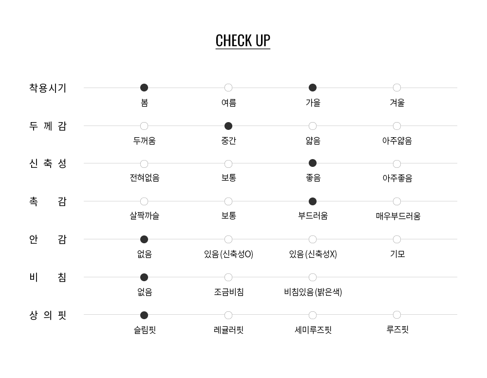 넥 부분의 버튼 디테일이 포인트를 더해주어 단독 착용 시에도 감도 있는 스타일링이 가능합니다.