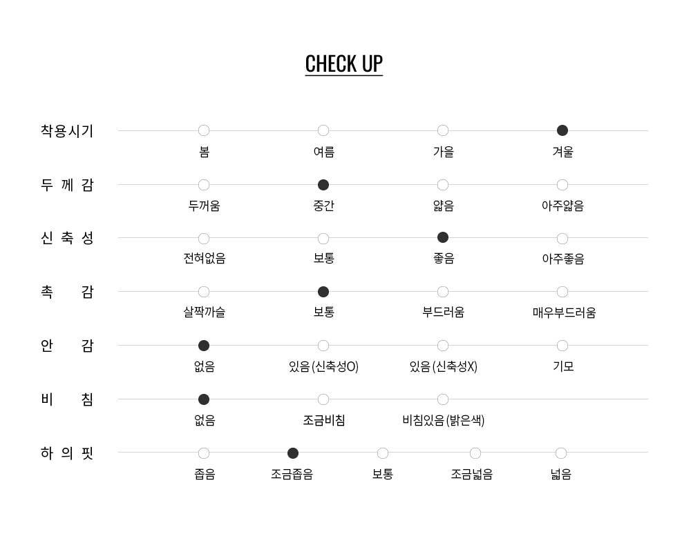 밀도 높은 코튼 스판 원단을 사용하였으며, 고퀄리티 스판사로 복원력과 텐션이 뛰어나며