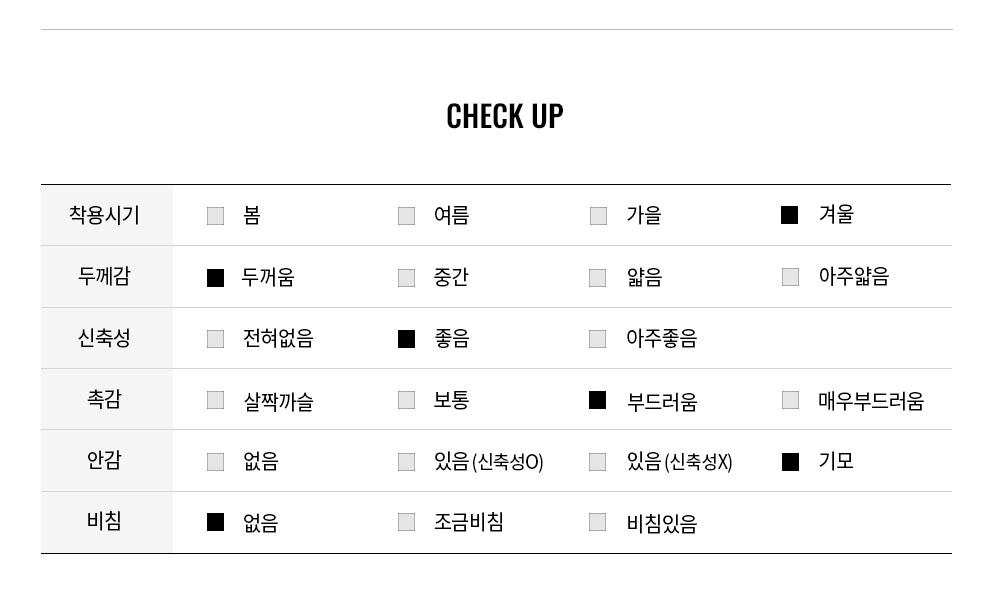 적당한 두께로 부담없이 착용 가능하며, 바지 안쪽에 기모가공을 하여, 부드러우면서 뛰어난 보온성이 특징입니다.