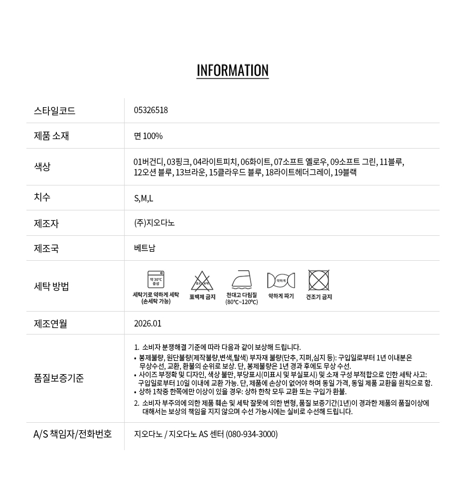 탄탄한 26S/1 DK 1x1 립 네크 디테일을 적용해 세탁 후에도 늘어짐을 최소화했으며,