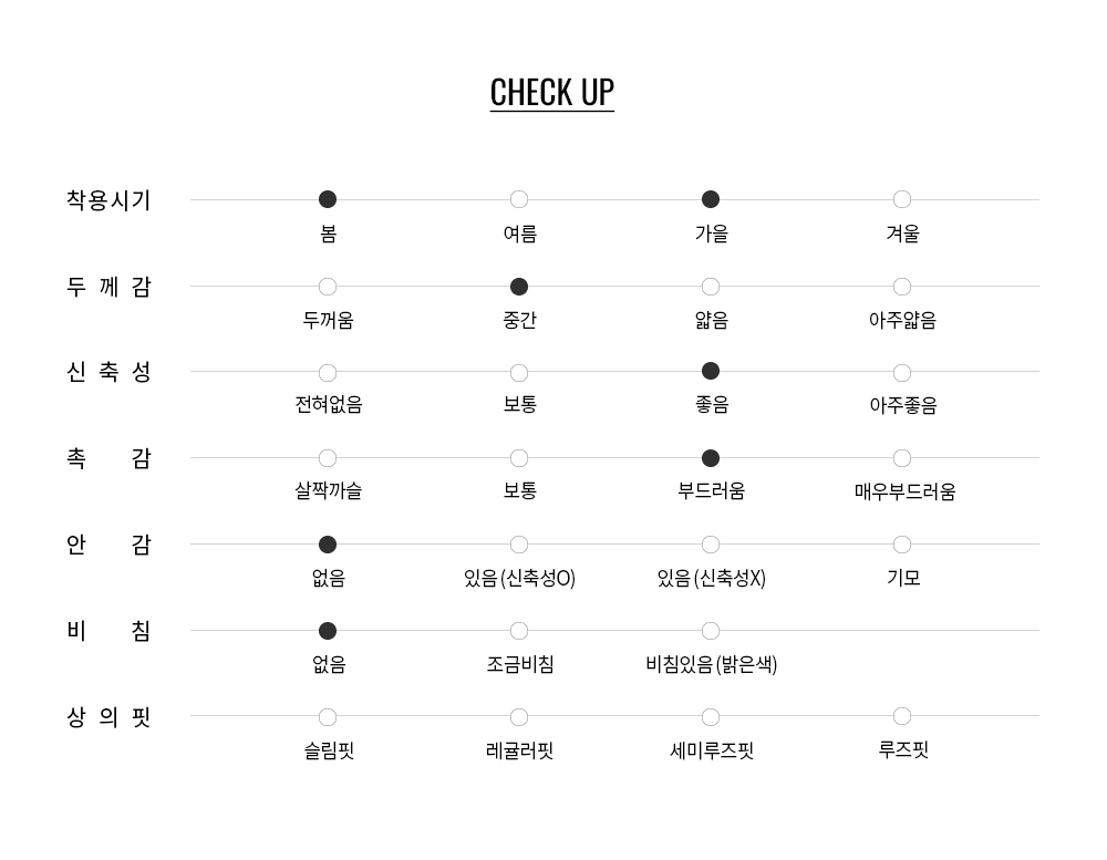 폴리에스터/라이오셀/폴리우레탄 혼방 소재를 사용하여 부드럽고 촉촉한 터치감과 뛰어난 신축성이 특징적입니다.
