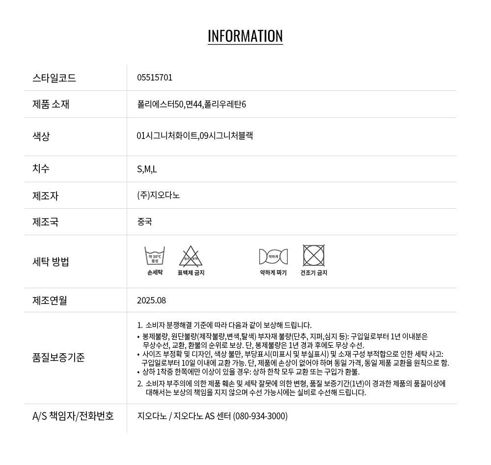 • 교환 진행시 배송비 5,000원 주문자 성함으로 입금 부탁드립니다(신한은행:267-05-028523 (주)지오다노)