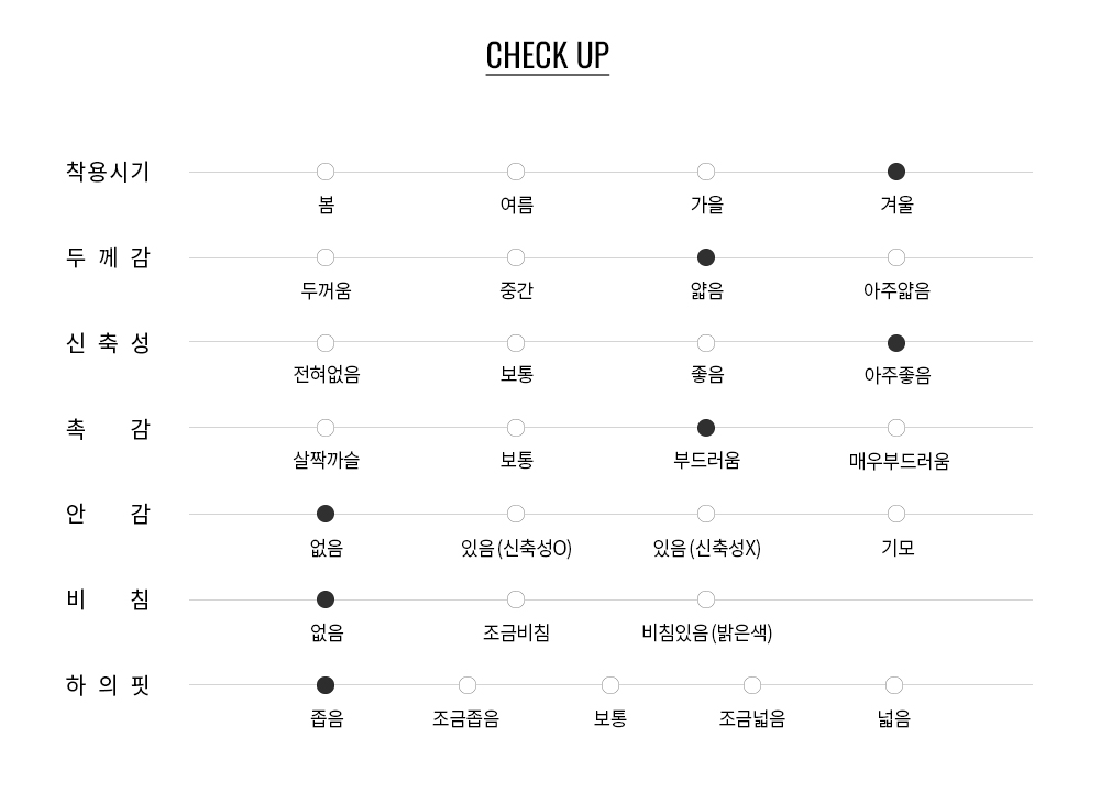 블랙 한 칼라로 구성되어 있으며, 한 겨울 내내 다양한 바지 이너로 슬림하고 쫀쫀하게 착용 가능합니다.