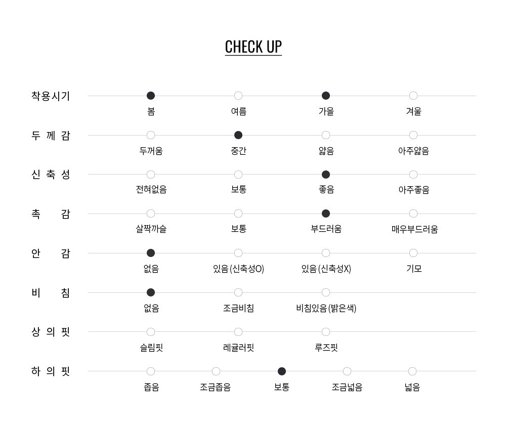 구김이 적고 형태 회복이 뛰어나 장시간 착용에도 깔끔한 외관을 유지하며, 세탁과 관리가 용이한 이지케어 소재입니다.