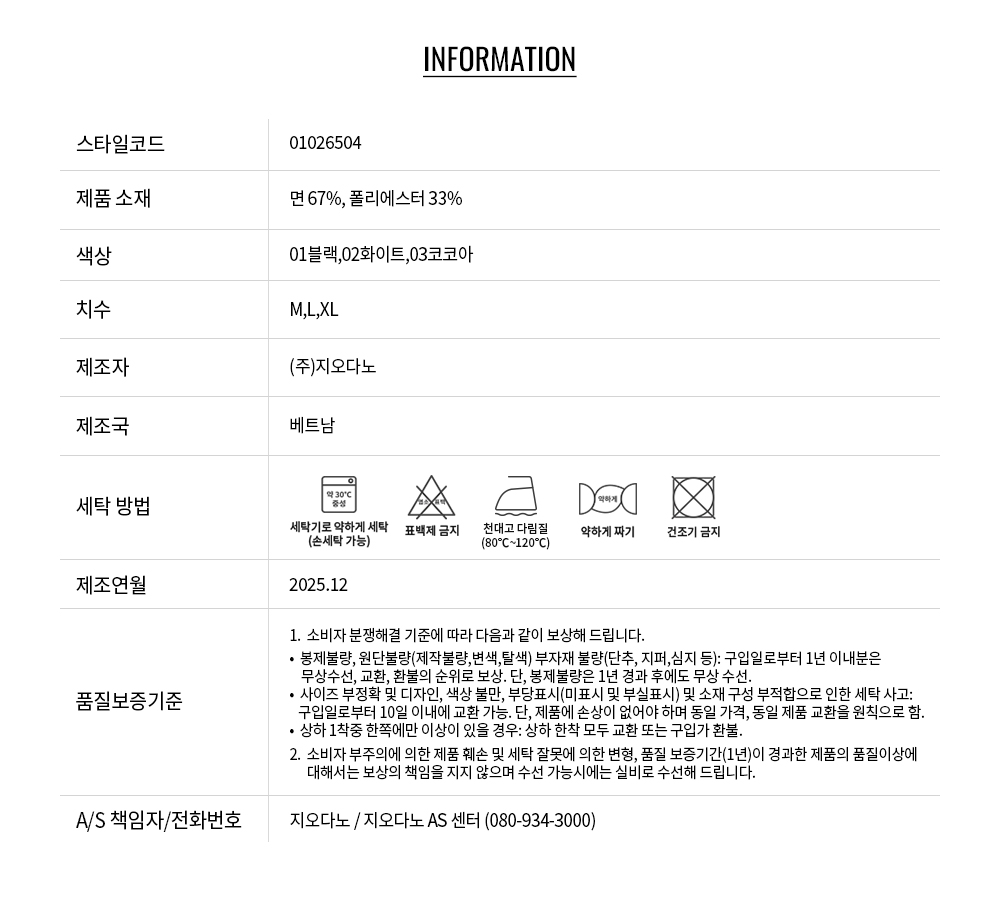 • 교환 진행시 배송비 5,000원 주문자 성함으로 입금 부탁드립니다(신한은행:267-05-028523 (주)지오다노)