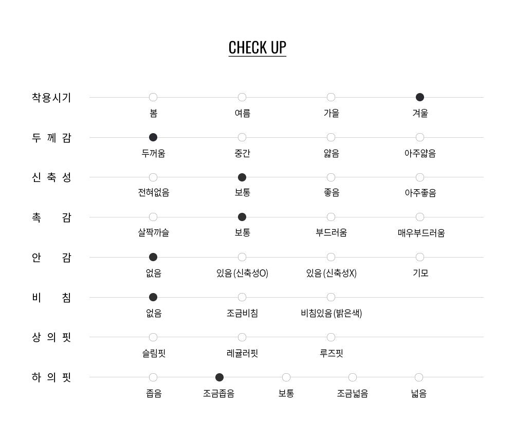 워싱으로 다듬어진 균형 잡힌 실루엣과 탄탄하고 정교한 밀도감이 스마트한 스타일에도 자연스럽게 어우러집니다. 기모 가공을 더해 부드럽고 따뜻한 착용감을 제공하며, 보온성과 편안함을 동시에 갖춘 시즌 아이템입니다.