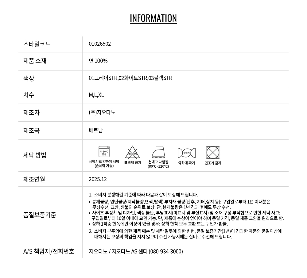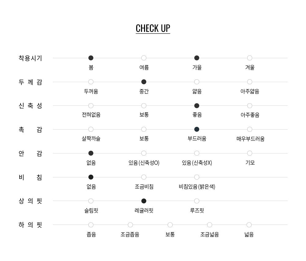 탄탄하면서도 부드러운 터치감으로 편안한 착용감을 제공하며, 데일리 웨어로 활용하기 좋은 소재입니다.
