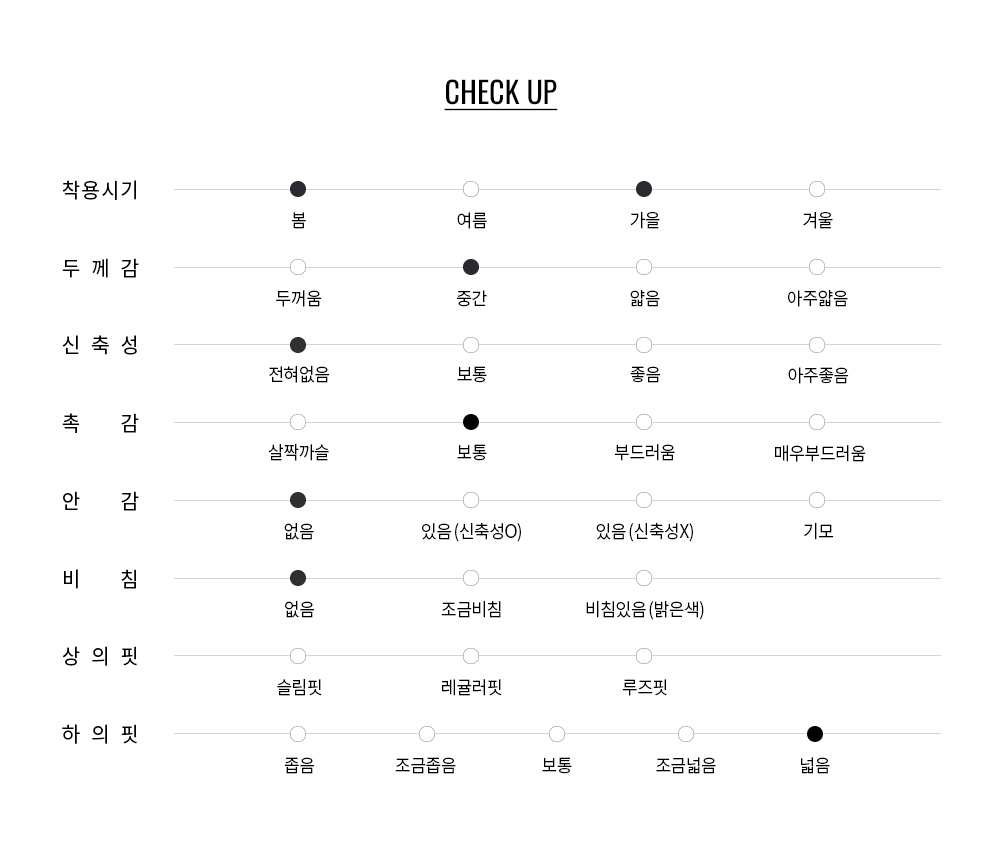 12oz~13oz 의 적당히 두께감 있는 원단으로 제작되어, 한여름을 제외한 사계절 내내 활용하기 좋은 스타일 입니다.