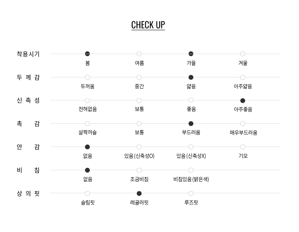 부드러운 터치감과 가벼운 착용감으로 단독은 물론 이너로도 활용도 높은 아이템입니다.
