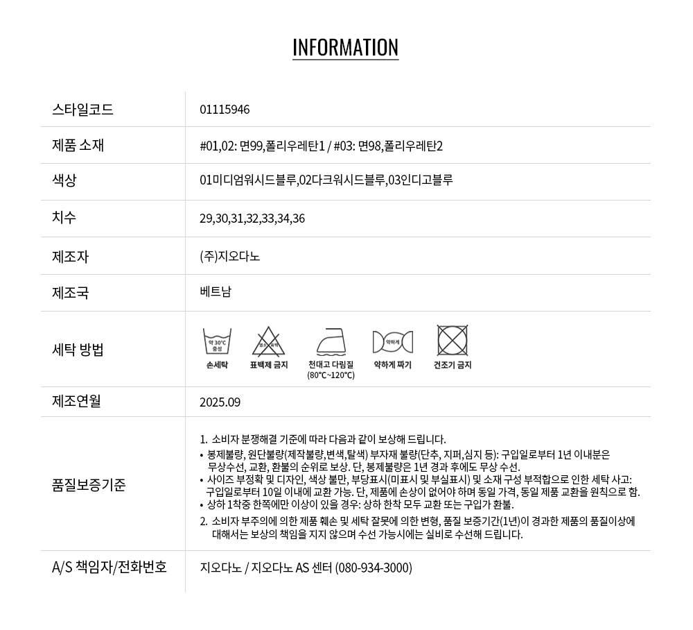 **데님 염료의 특성상 이염 및 물빠짐이 불가피하므로 반드시 미지근한 물에 뒤집어서 단독 세탁하시기 바랍니다.