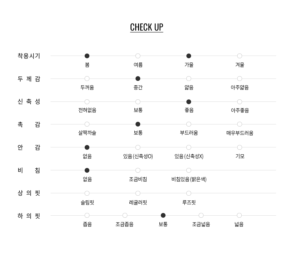 표면 가공을 더해 부드러운 촉감과 함께 탄탄한 조직감을 갖췄으며, 스판 원사가 함유되어 활동성과 착용감이 편안합니다.