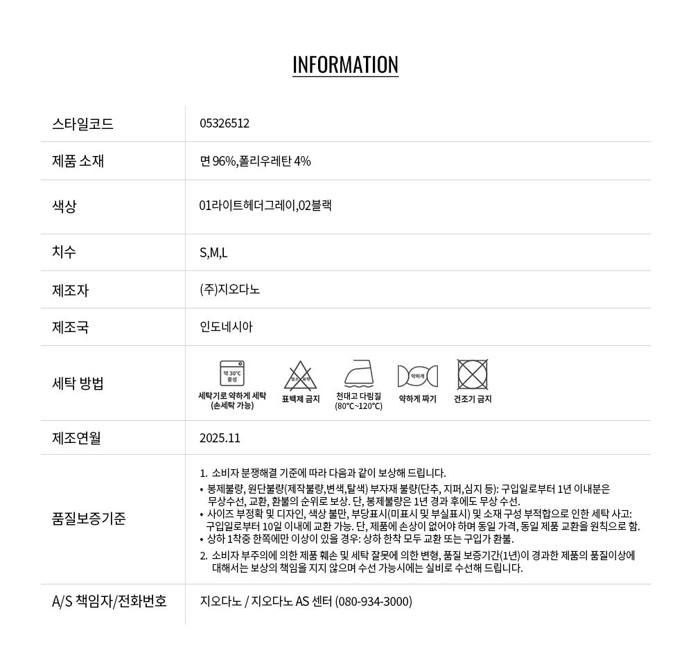 유연한 신축성과 복원력이 뛰어난 립 조직으로 편안한 착용감을 제공하며, 깔끔하게 떨어지는 실루엣을 유지해줍니다.