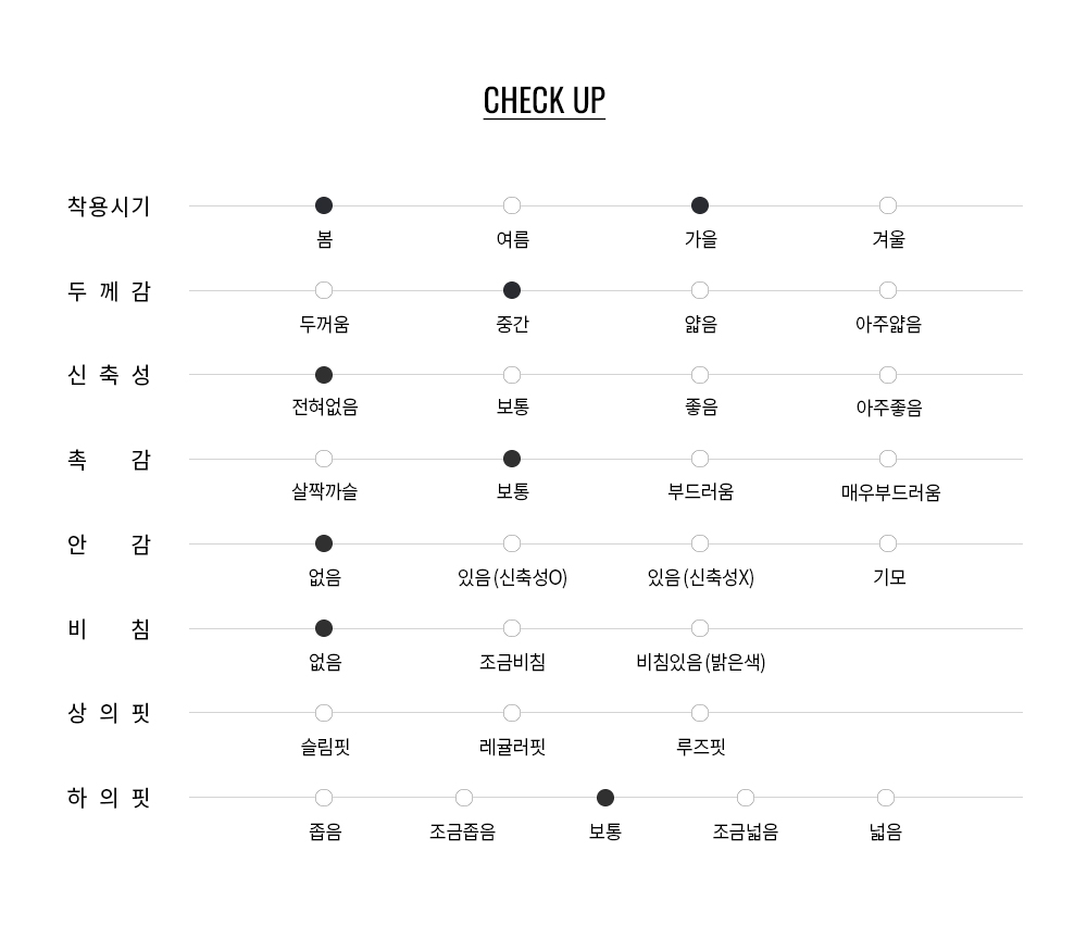 20수 코튼 트윌 원단으로, 레귤러 실루엣을 안정적으로 받쳐줍니다.