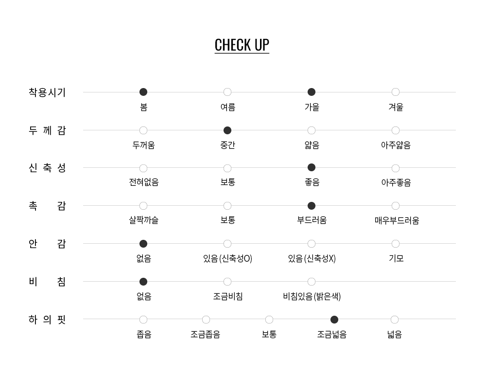 스마트한 무드의 TR혼방 소재를 사용하였으며, 스트레치가 있어 착용시 매우 편안합니다.