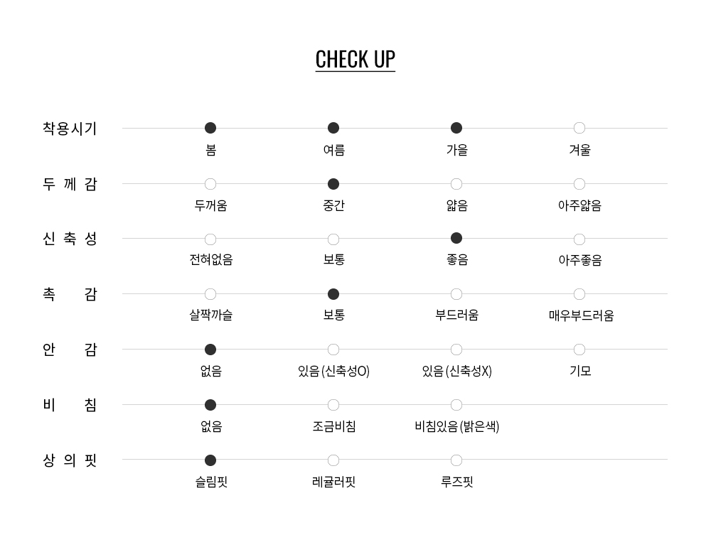255g/sqm중량의 텐션감 있는 스판 원단을 사용하여 부드러운 촉감과 우수한 신축성을 선사합니다.