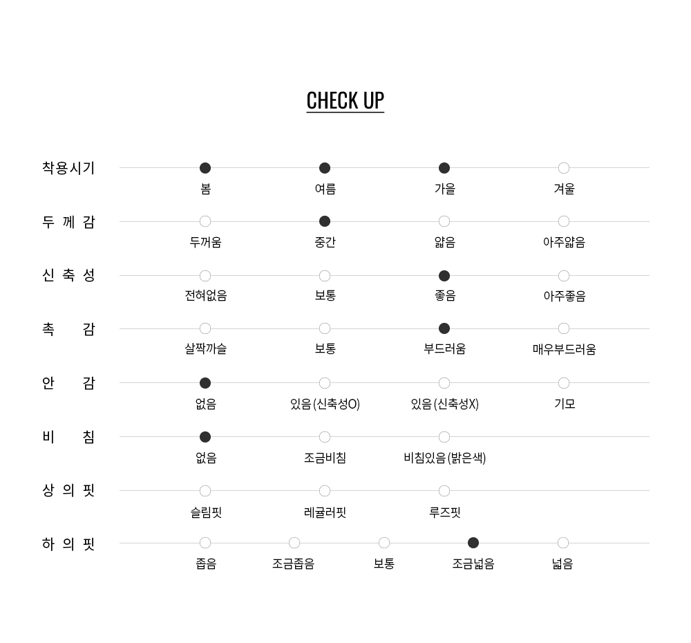 스판 원사 없이도 우수한 신축성과 복원력을 갖춰, 장시간 착용 시에도 편안함을 유지합니다.
