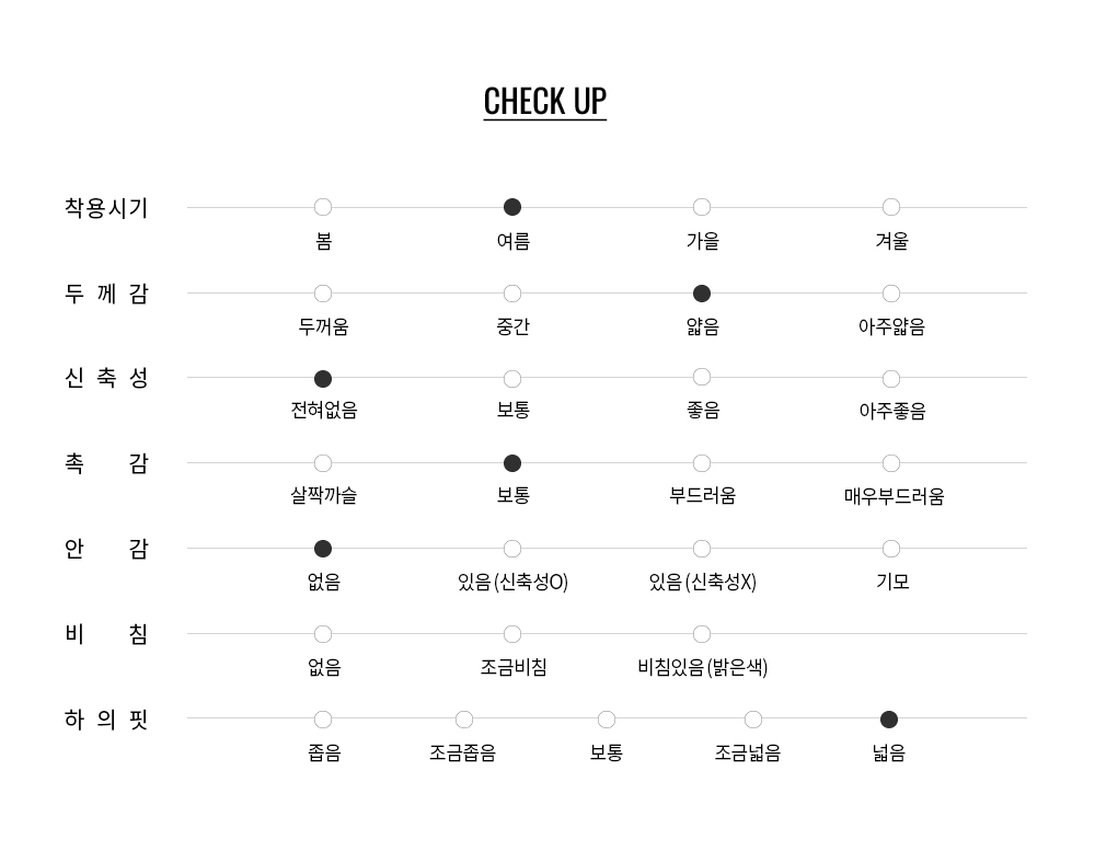 9~10oz의 적당히 얇은 원단을 사용하여 여름철에도 시원하게 착용 가능한 적당한 두께감