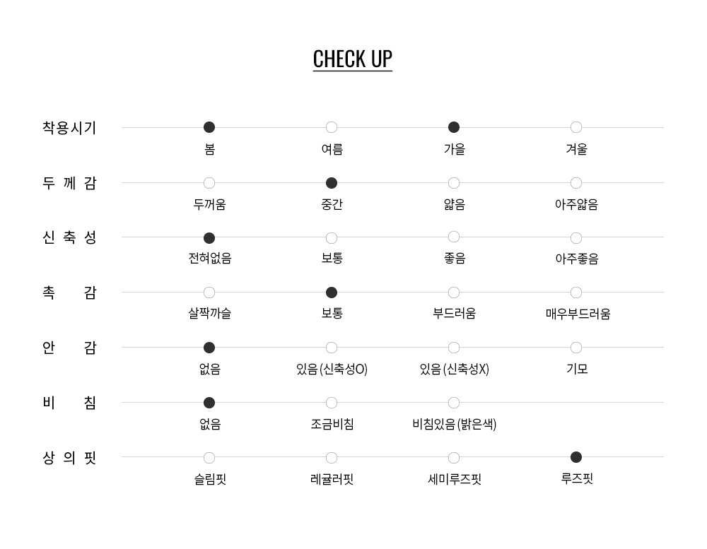 봄 시즌 다양한 하의와 매치하여 데일리부터 캐주얼한 무드까지 폭넓은 스타일링이 가능합니다.