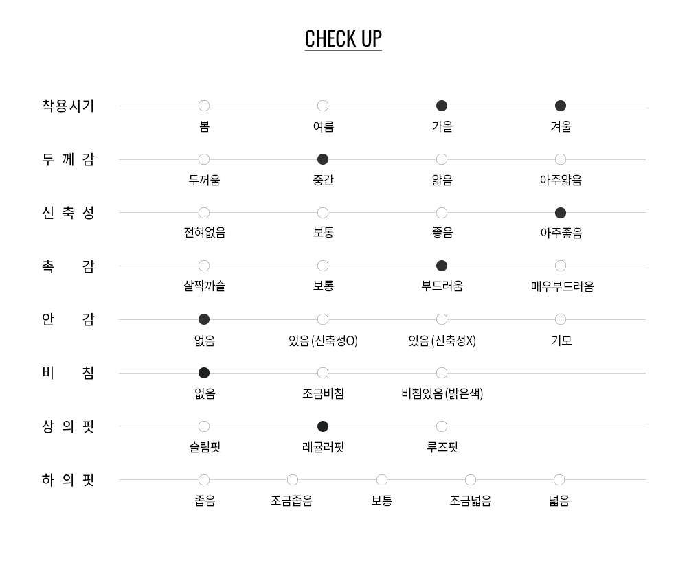 40수 코튼 인터록(Double Knit) 구조로 짜여 밀도감이 높은 원단입니다. 양면 조직으로 형성된 구조 덕분에 내구성과 복원력이 우수하며, 표면에는 캐시미어 터치 가공(Cashmere Touch Finish)을 적용하여 부드럽고 고급스러운 촉감을 구현했습니다.