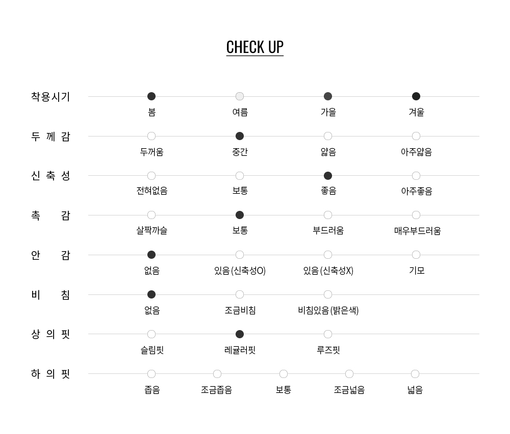 조직은 밀도있는 쉐이커 립조직으로 편직하여 깔끔하게 떨어지는 외관이 특징입니다.