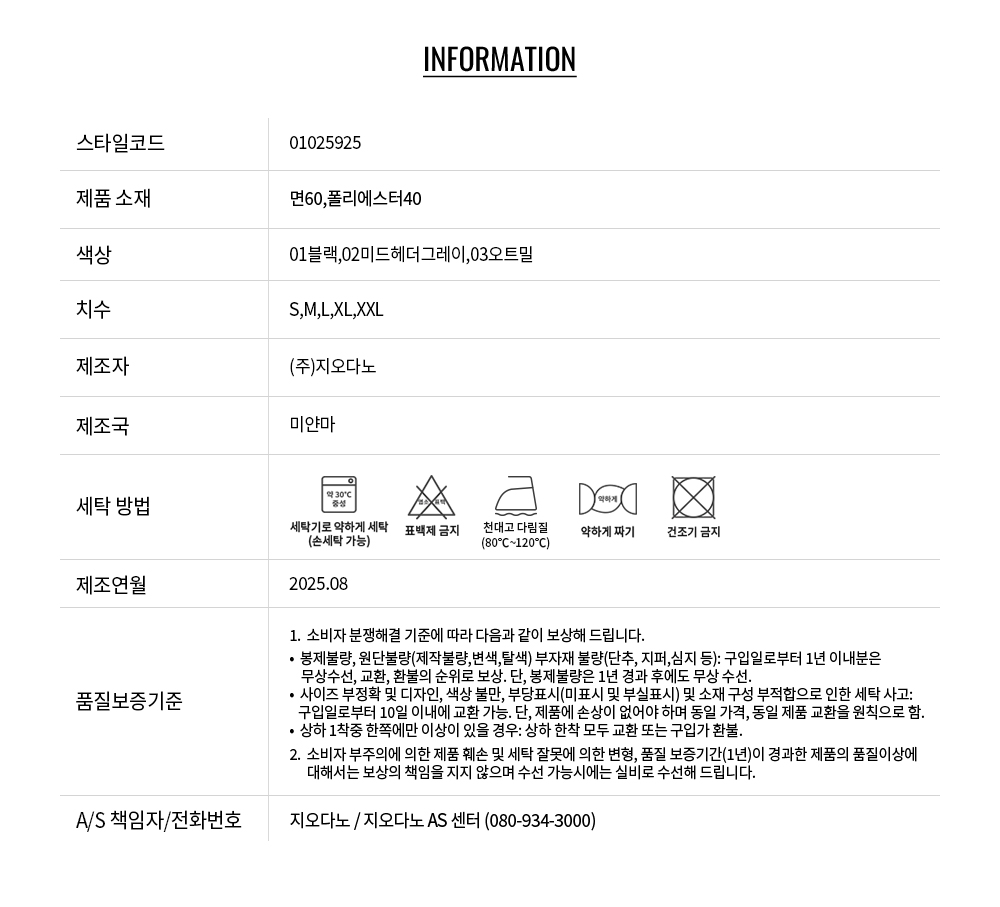 | 배송방식 | 지오다노 물류센터 / CJ대한통운 |