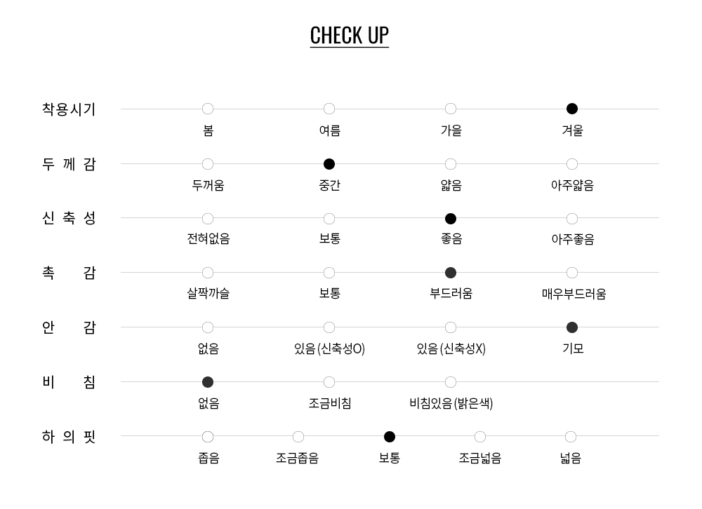 또한 구김이 적어 관리가 용이하고 안쪽에 브러쉬드 기법을 더해 착용시 부드러우며 두께감 있는 원단이 체온을 유지해 주어 F/W 시즌에 최적화된 보온성을 제공합니다.