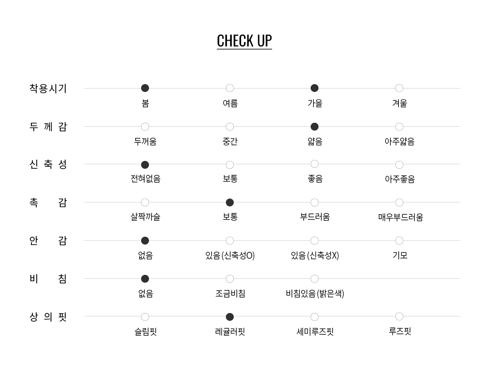 데님, 슬랙스, 코튼 팬츠 등 다양한 하의와 자연스럽게 어우러져 데일리부터 세미 캐주얼까지