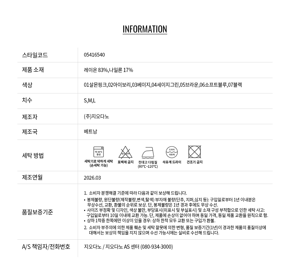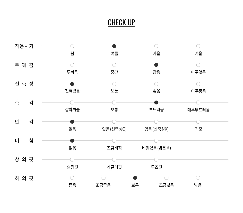 나일론과 레이온 혼방 소재를 사용 하였으며 NR 소재 특유의 부드러운 터치감과 은은한 광택감이 더해져