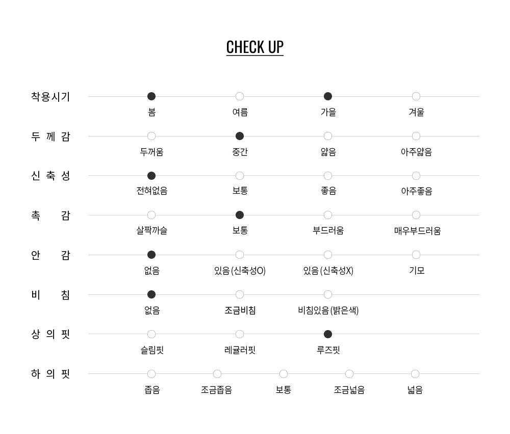 적당한 중량감과 구조감으로 간절기 시즌에 가볍게 걸치기 좋은 셔츠 아우터 소재입니다.