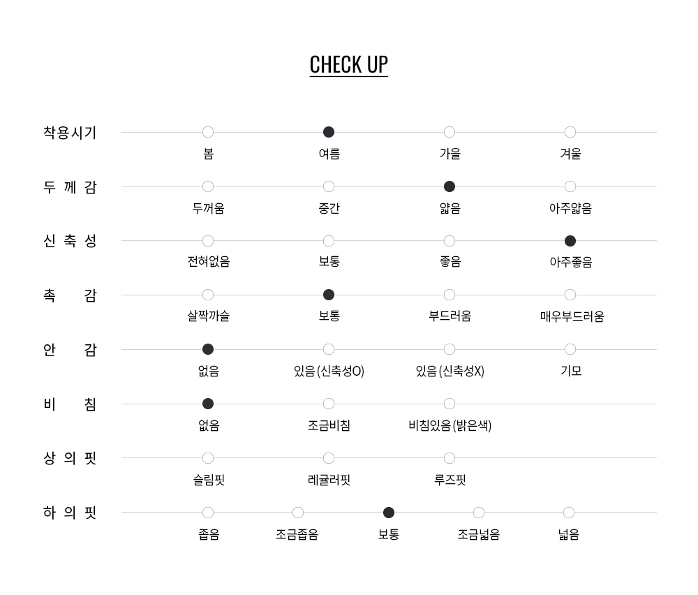 코튼 93%, 스판 7%의 사방 스트레치 경량 원단으로 활동성이 뛰어나며, 가볍고 유연한 원단감으로 편안하게 착용 가능합니다.