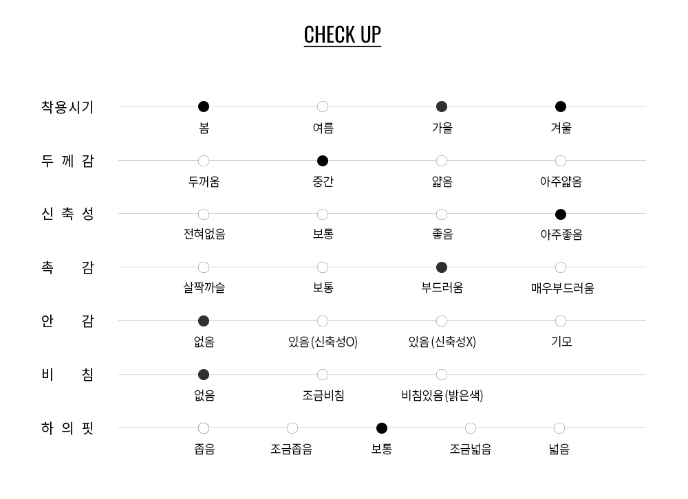 380g/㎡(480g/yd²) 중량의 폴리 코튼 스판 원단에 두께감 있는 골이 돋보이는 코듀로이 원단을 사용하여, 은은한 광택감과 따뜻하고 포근한 착용감을 제공합니다.