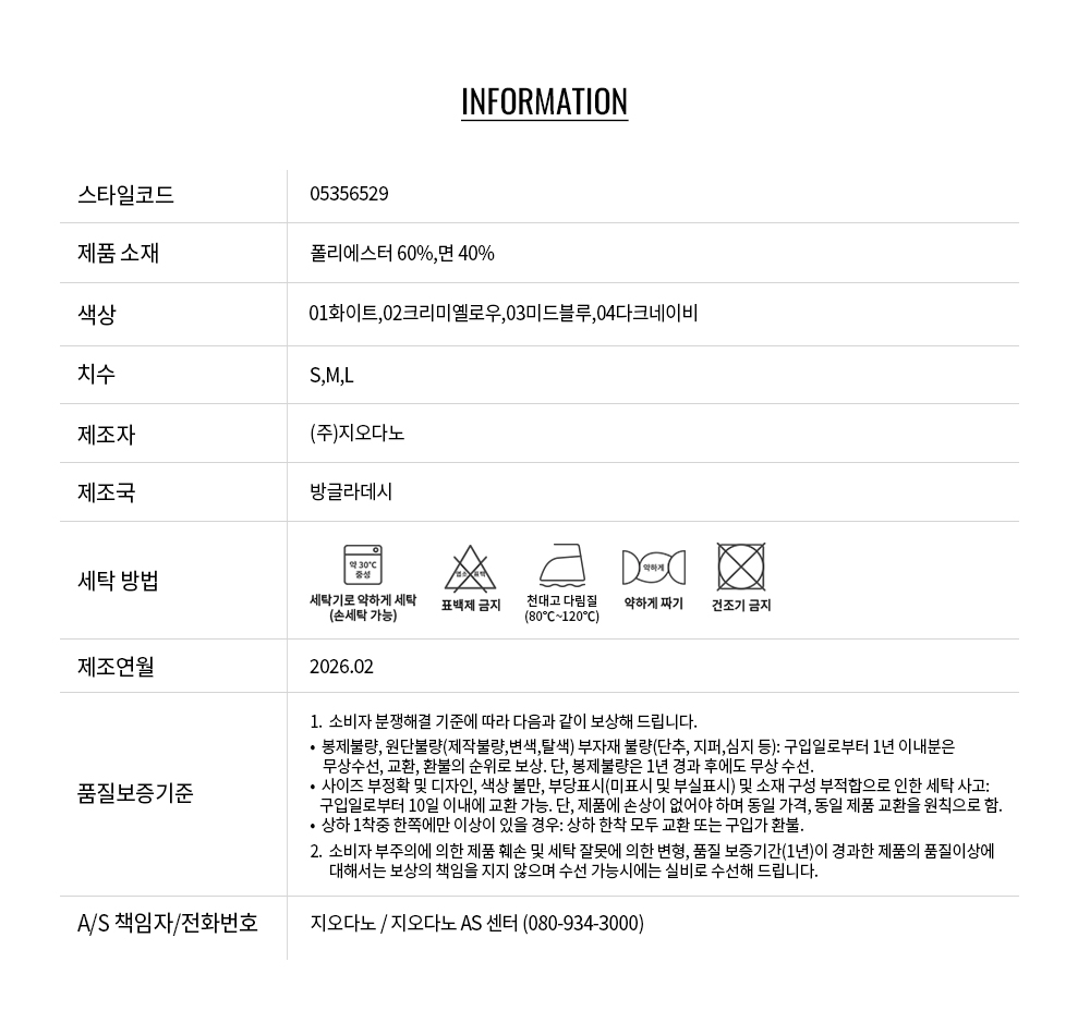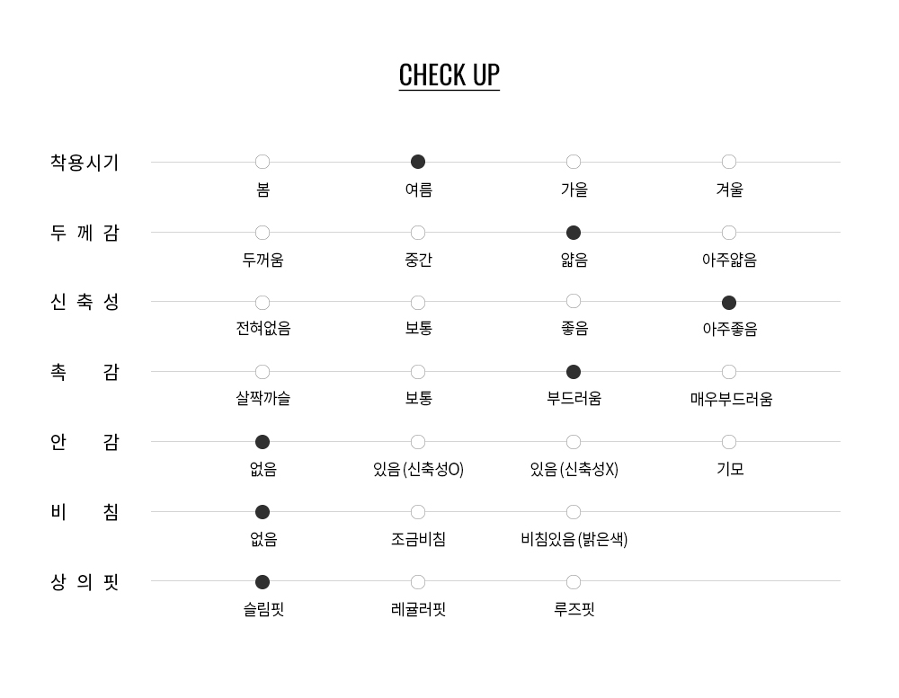 14GG로 은은하게 쉬어한 텍스쳐가 느껴지며, 과도한 비침없이 가볍고 세련된 착용감을 제공합니다.