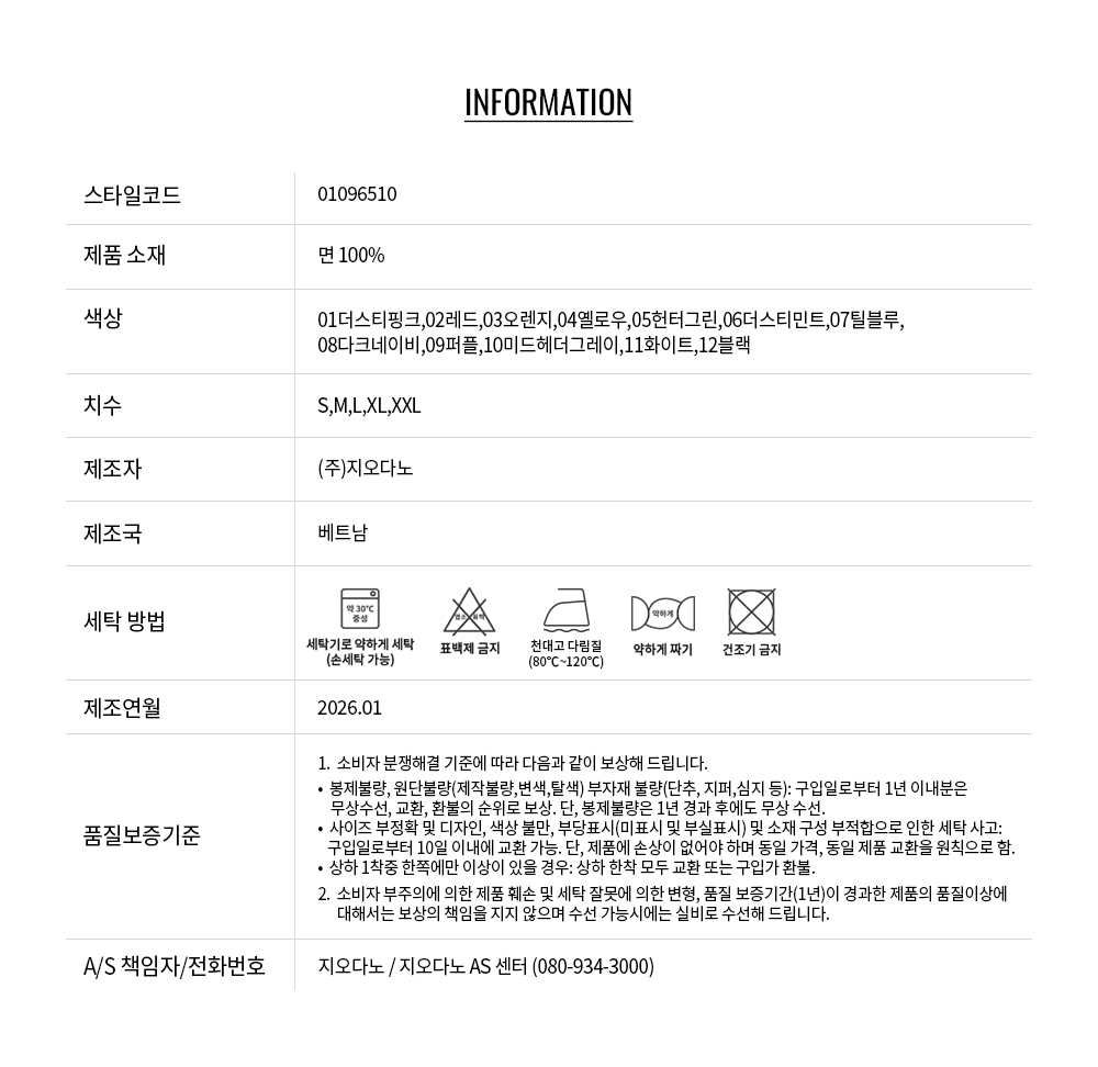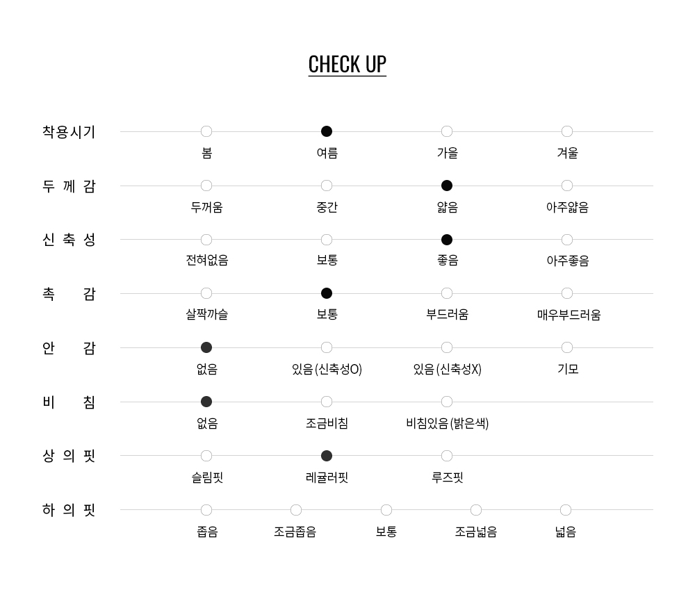 밀도 있는 조직 덕분에 비침이 적고, 형태 유지력이 뛰어나 잦은 착용과 세탁에도 흐트러짐 없이 착용 가능합니다.