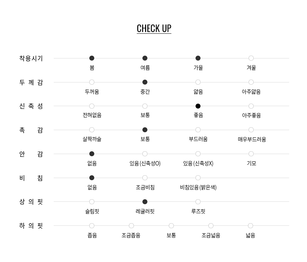 적당한 조직 밀도로 여름 시즌 단품 착용에도 부담 없으며 가벼운 착용감을 구현합니다.